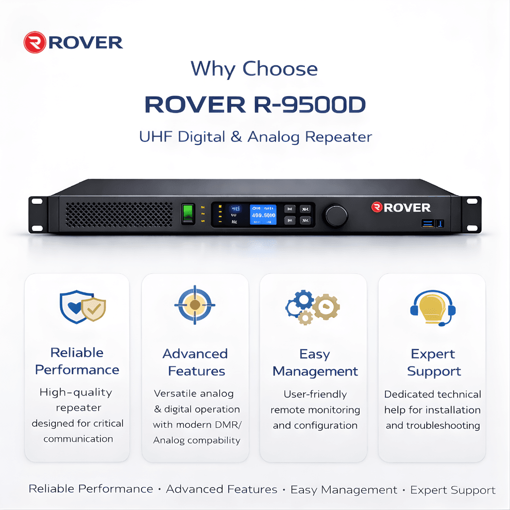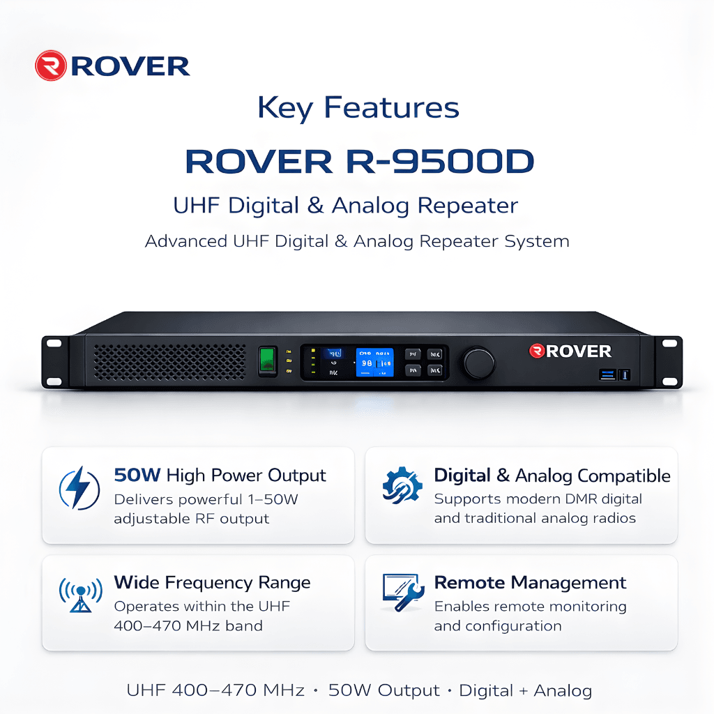 The ROVER R-9500D is a high-performance UHF analog and digital dual-mode repeater engineered for professional communication networks. Designed for enterprise, industrial, and security operations, it supports DMR and analog working modes with up to 50W output power for extended coverage. Featuring TDRA-compliant frequency configuration (400–470 MHz), IP-rated durability, and cross-mode capability (optional), the R-9500D ensures stable, continuous, and regulation-ready communication for business-critical environments.
